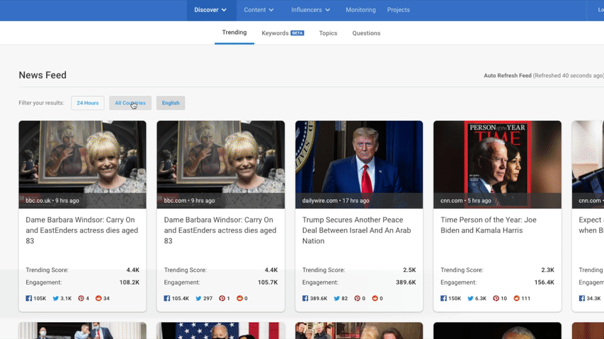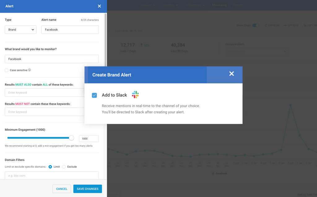 To do this, I usually set up Alerts in the Monitoring part of BuzzSumo, based on evergreen news stories that I’ll always want to know about.