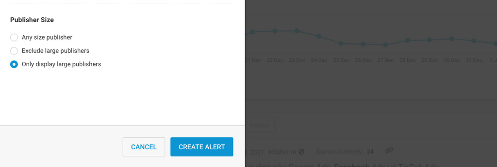 We’re aiming to refine this trend feed even further by amending the alert to add a publisher size filter. This will help us focus on only the best headlines written about Facebook by large publishers.
