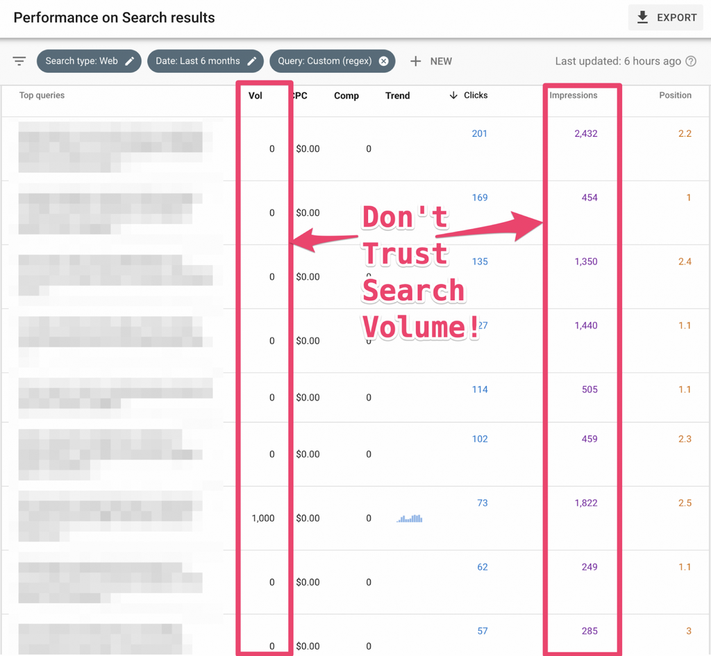 Sharing a screenshot of his clients’ Google Search Console, Toth compared the thousands of impressions they’d landed for long-tail (16+ words), low-volume phrases against a sorry-looking search volume column full of zeros.