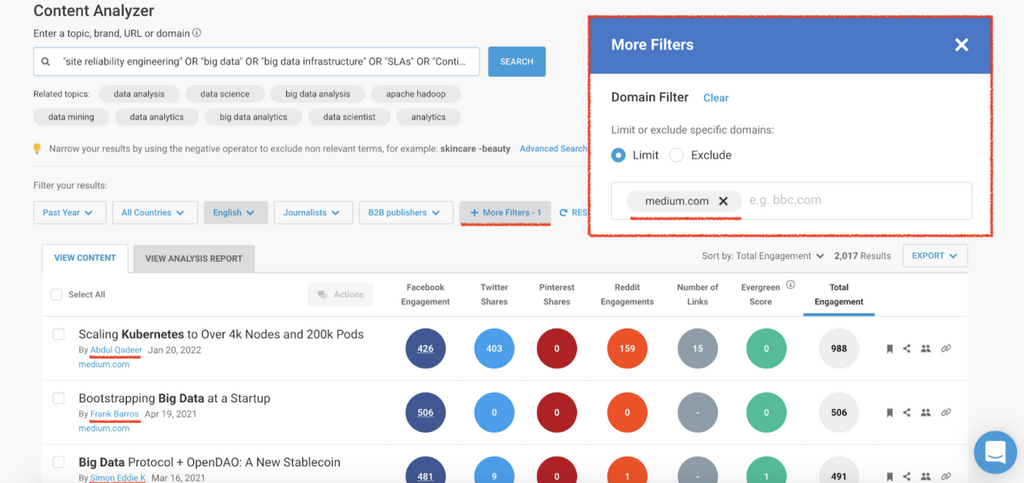 Using BuzzSumo’s Content Analyzer tool, they search a range of niche topics, and apply a domain limit filter to hone in on “Medium.com”.