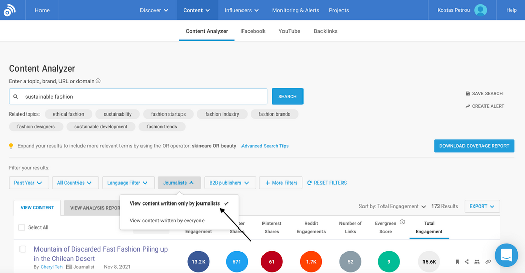 1. Whilst I am doing my initial research on BuzzSumo, I will find out who wrote the articles I was interested in, using the Journalist Profiles feature.
