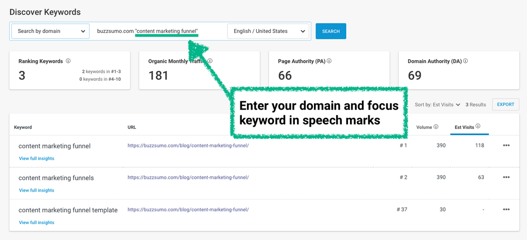 Enter your domain followed by the focus keyword in speech marks, to find out the rankings and estimated visits of your evergreen content.