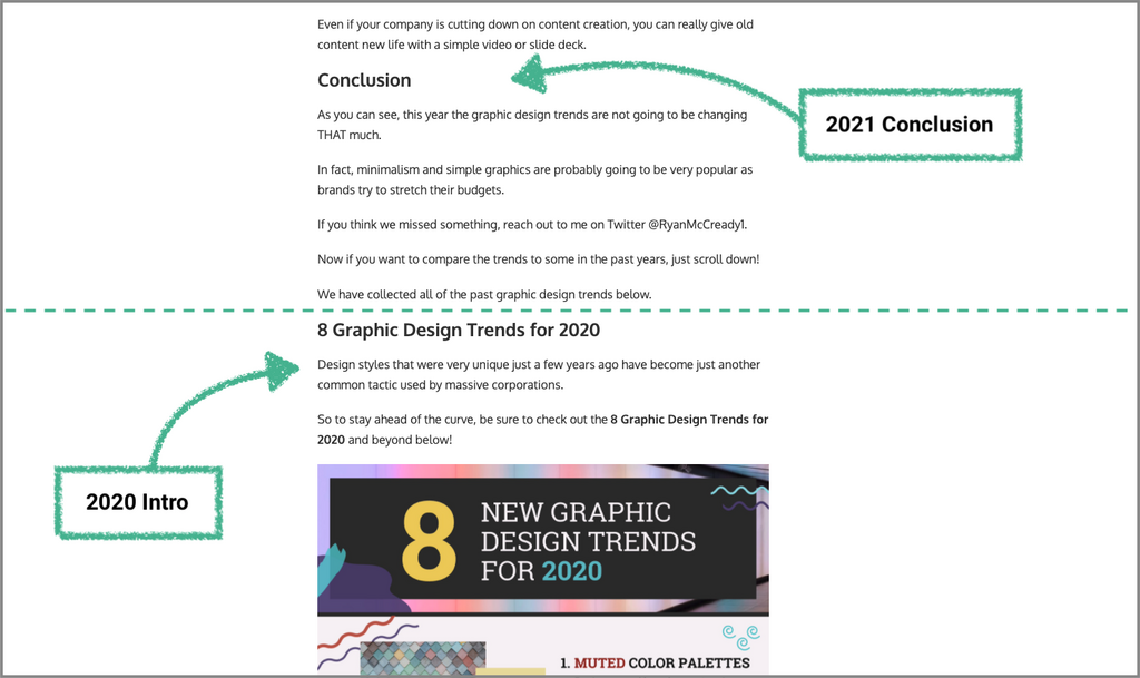 • Venngage takes an entirely different approach; updating its yearly graphic design trend blog, simply by writing the new content above the old.