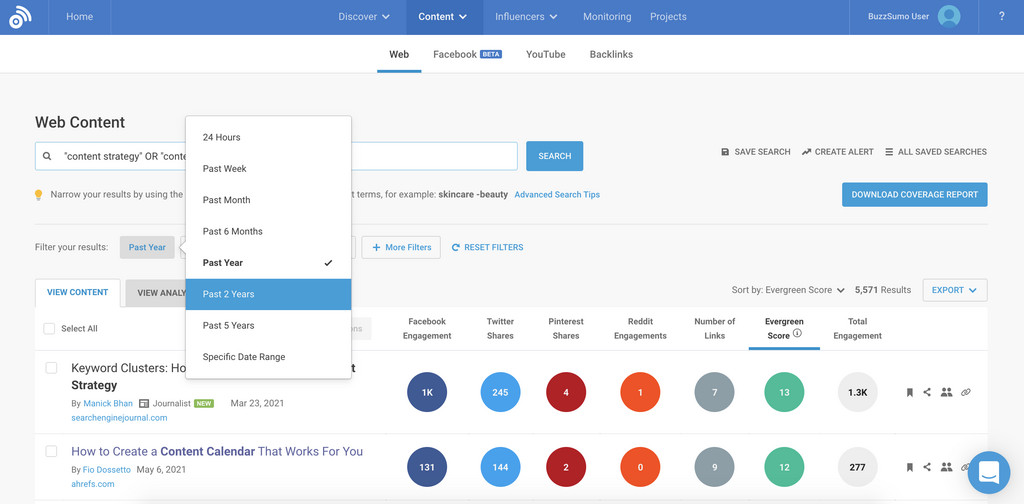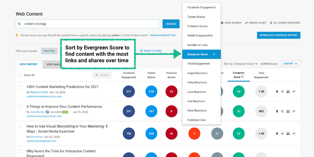 Rather than sorting by total shares or links, the evergreen filter shows the top posts that consistently gain shares and links over time.