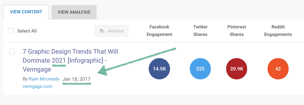 In the same way that you can keep tabs on your competitors’ evergreen content shares via the BuzzSumo Chrome Extension, you can also track shares of your own content.