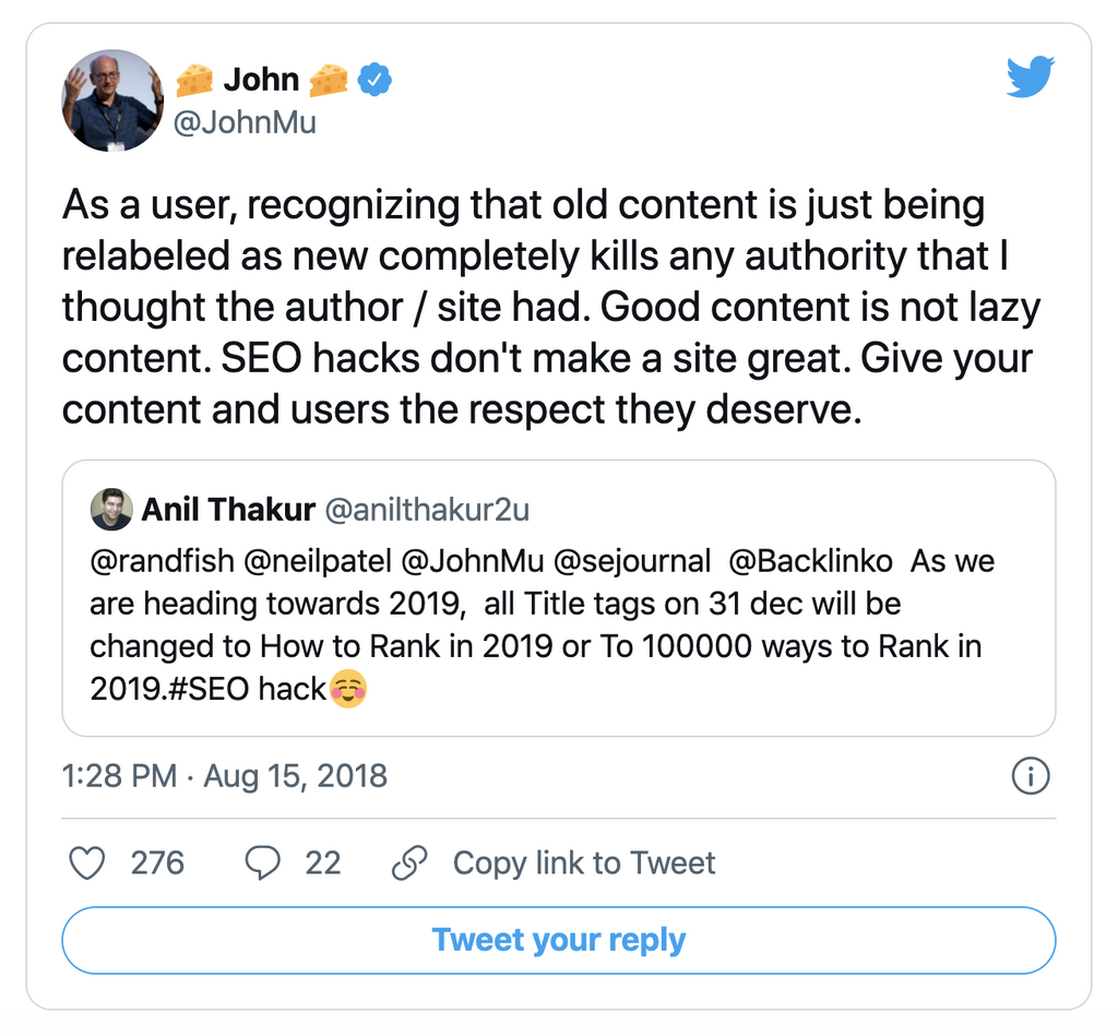 Relabeling old content as new “completely kills authority” in the words of Google Search Advocate John Mueller.