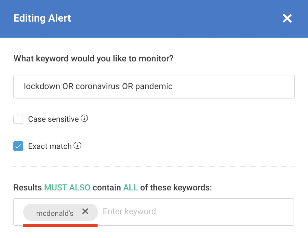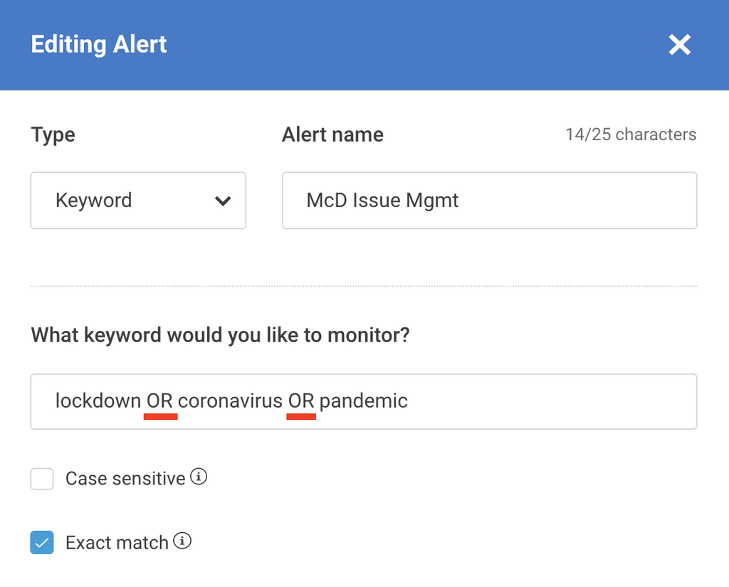 If you think yours or your competitors’ brand is likely to be named-and-shamed in relation to the known crisis, make sure you edit the alert to focus on ‘Title & Topic’ content rather than ‘Title, Topic & Article Text’.