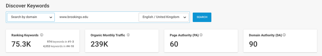 This will return a lot of interesting stats, including the number of keywords the domain in question is ranking for, its organic monthly traffic, or monthly readership, and its page and domain authority – which highlights credibility and ability to collect links.