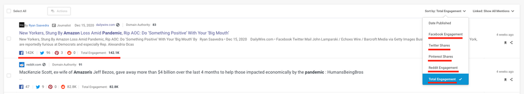 1. In BuzzSumo’s crisis monitoring tool, each returning article is accompanied by the amount of engagement it attracted on the social media networks Facebook, Twitter, Pinterest, and Reddit.