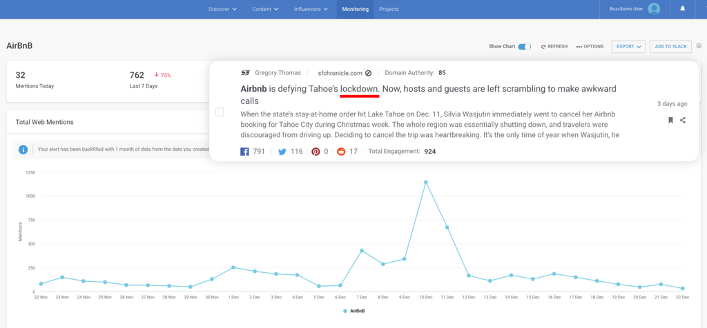 For example, when we set up a brand alert for Airbnb, one of the most engaged with headlines within the last three days was a negative story, reporting that Airbnb broke local lockdown rules.