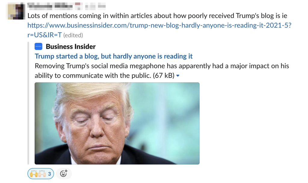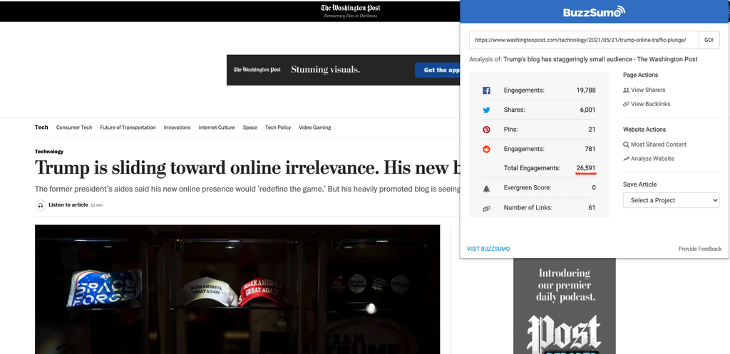 The Washington Post liked the data (🥳 ), and used it as the basis of their article: Trump is sliding toward online irrelevance. His new blog isn’t helping, which was shared 26k times (at time of writing) according to the BuzzSumo Chrome Extension.
