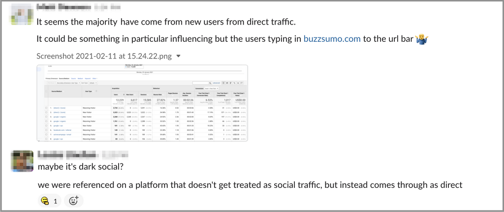 We deducted the traffic was likely coming from “dark social”, which meant either that BuzzSumo had been shared on private network, or that it had been mentioned – but not linked to – on social media.