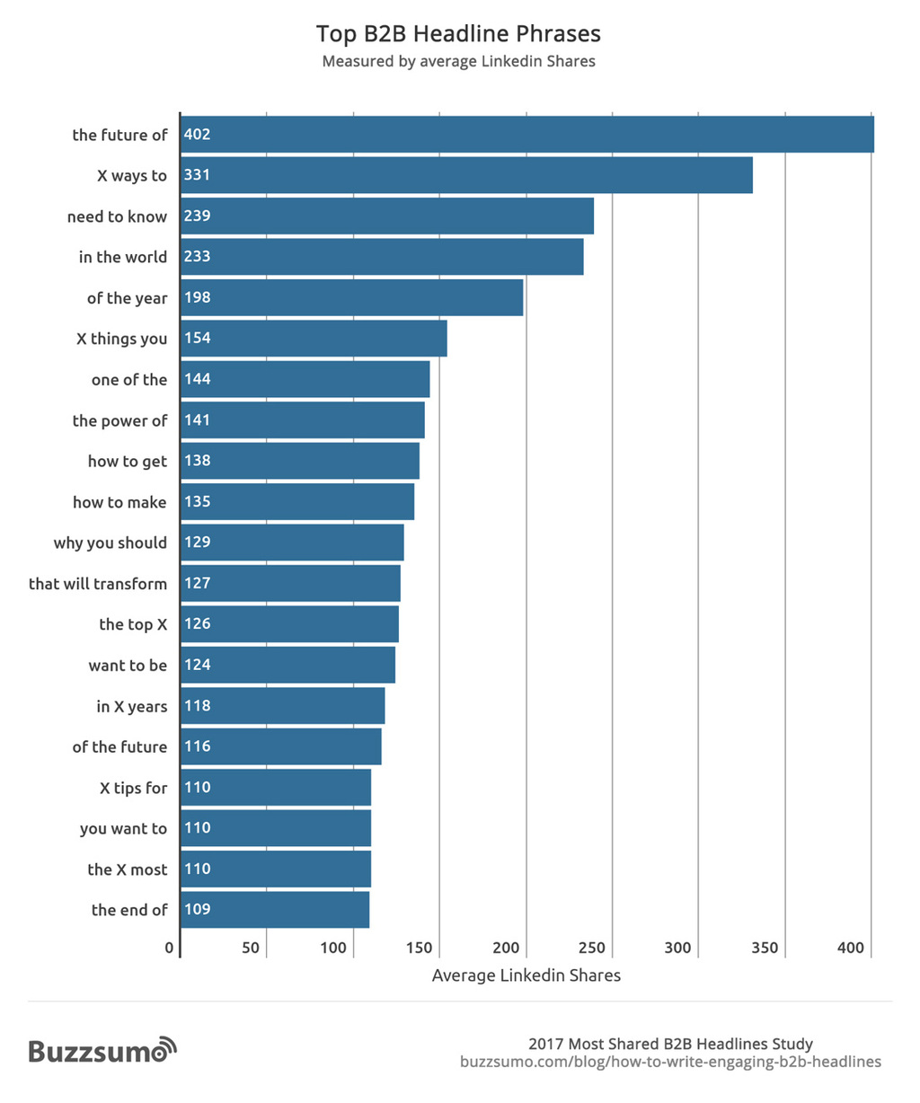 Update: 18th July 2017. We have now completed our analysis of the best B2B headlines where we reviewed the 10 million most shared posts on LinkedIn in 2017. We found significant differences between the best headline phrases, structures, numbers and lengths for B2B headlines compared to B2C headlines.