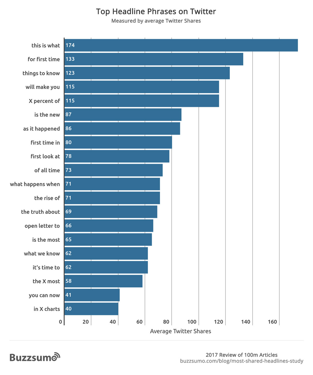 Will a headline that works on Facebook work equally well on Twitter? Not necessarily. We found the headline phrases that gained the most engagement on Twitter were quite distinct from those that gained high engagement on Facebook. The main exception was the powerful “will make you” phrase which was the top phrase on Facebook and also the fourth most shared phrase on Twitter.