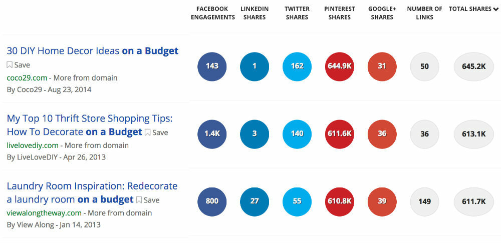 It was interesting to see how poorly phrases like ‘on a budget’ performed on Facebook. While some individual articles did well, the average Facebook engagement was very low. By contrast the phrase ‘on a budget’ appears to work really well on Pinterest for DIY topics. See the examples below.