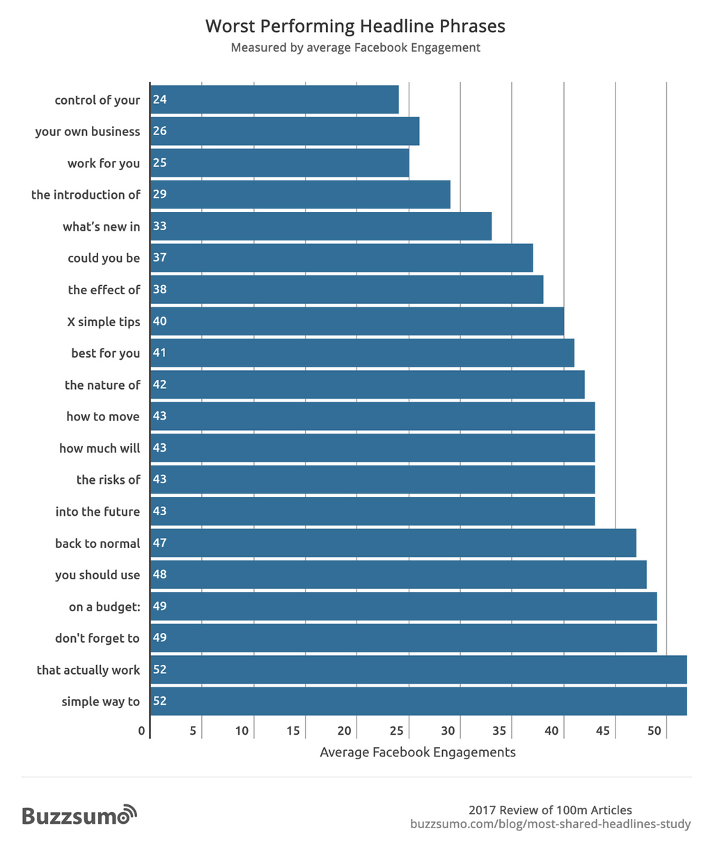 We thought it would also be interesting to examine the commonly used phrases in headlines that receive the lowest Facebook engagement.