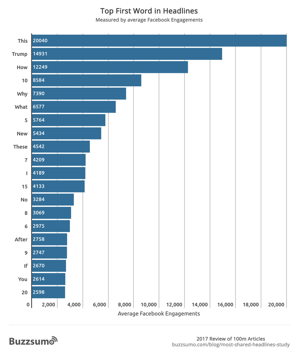 Finally, below are the most popular first words that start headlines by average Facebook interactions.