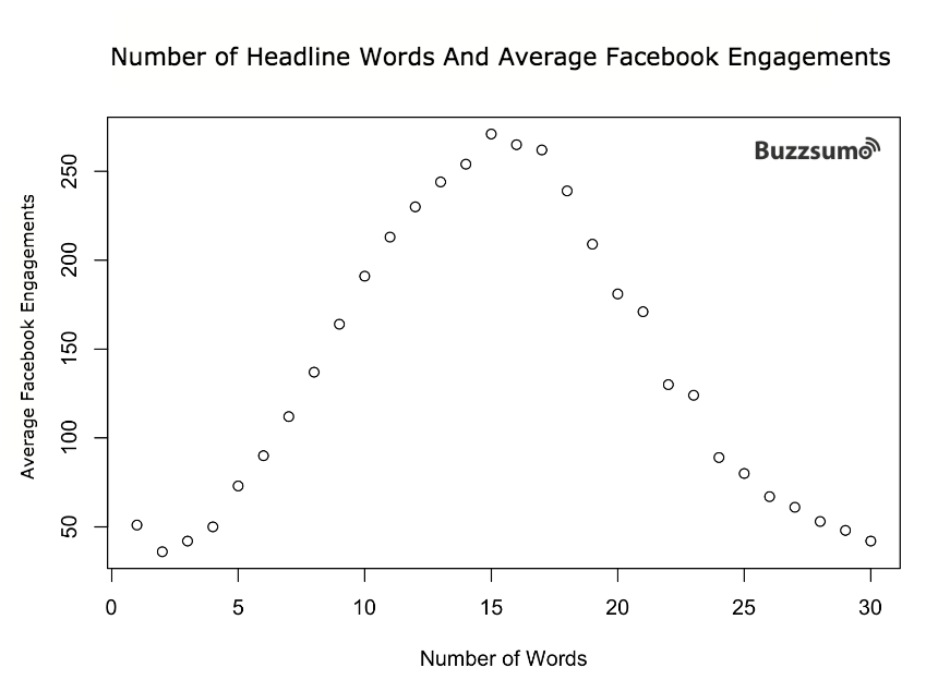 We can see that posts with twelve to eighteen words in the headline receive the highest number of Facebook engagements on average. As headlines get longer or shorter the average number of Facebook engagements decline.