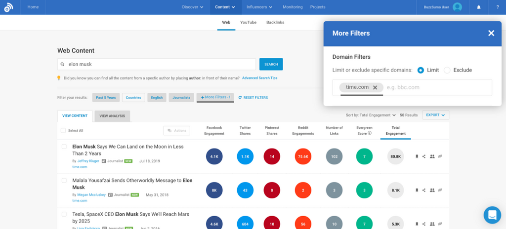 If you want to do some analysis of headline phrases yourself, you can simply put a phrase in double quotes into BuzzSumo such as “can we guess”. The search will return the most shared articles with that phrase in the headline and display the share counts from each network and the number of linking domains. Here is an example of the most shared posts for “the future of“. You can further refine your search by adding additional words after the phrase in quotes, here is an example: “the future of” Elon Musk. This will return the most shared headlines with the phrase “the future of” and Elon Musk. You can do this for multiple phrases or phrases and topics.