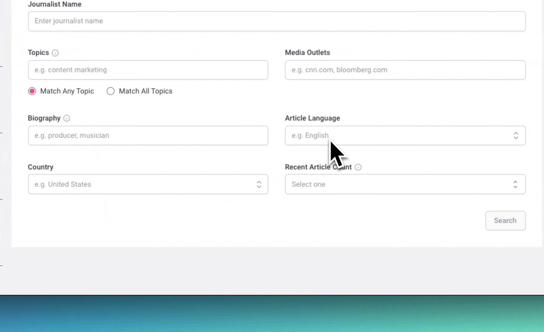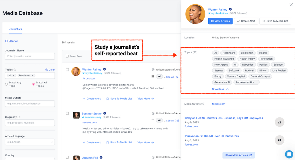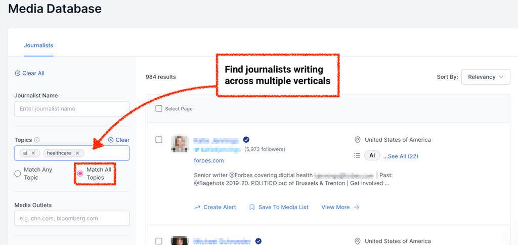All you have to do is hit “Match all” when you search for multiple topics, and you can start to build a diverse list of journalists.