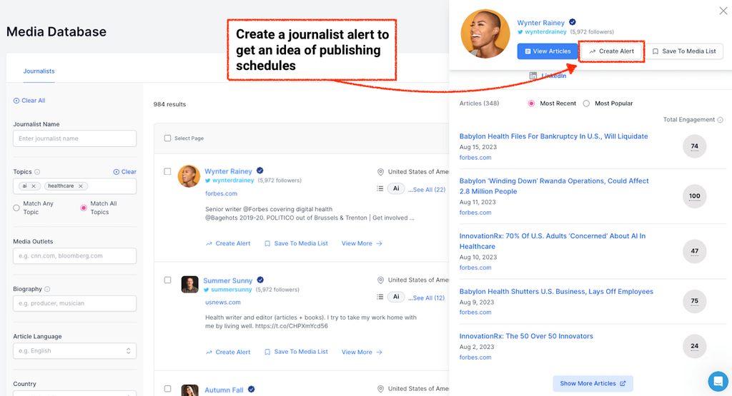 In BuzzSumo’s Media Database you can find journalists writing about 150K+ topics, and expand your chances of landing coverage by tracking down the journalists who write across multiple beats – because if they can't use your story for one publication, they may be able to publish it in another.