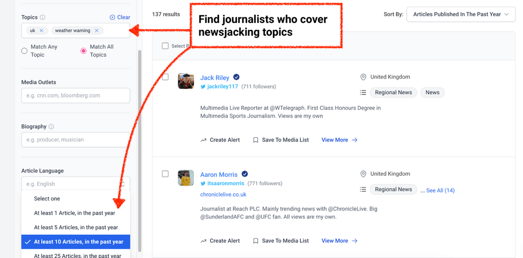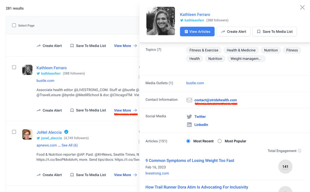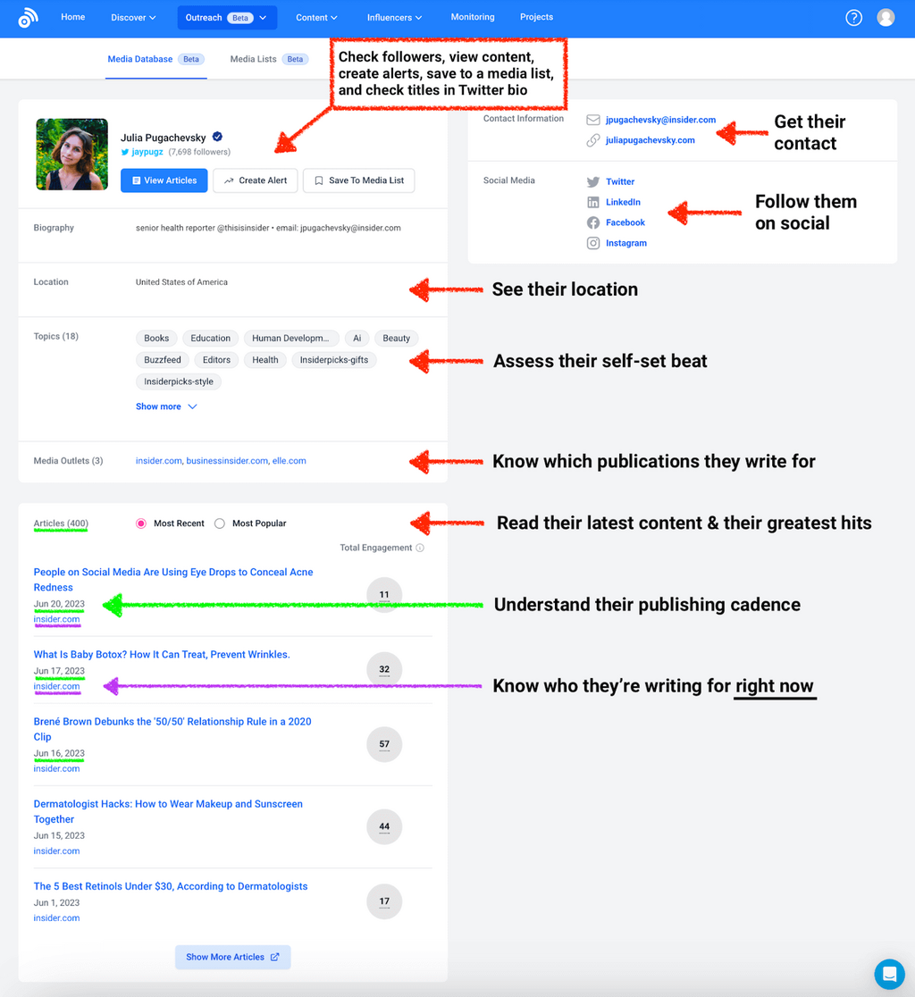 Once a journalist has caught your eye, check out their beat, article engagement, and publications.