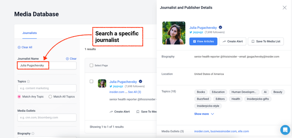 The database gives you cards showing journalist's most recent and far-reaching coverage, their social media accounts, bio information, and more – all at the point of pitching.