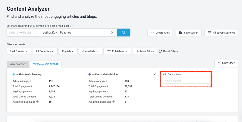 Do an “Author” search for your journalist, and in the “Add comparison” box, add another. You can analyze up to 10 journalists at a time.