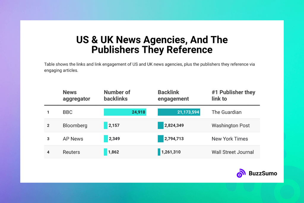 We analyzed the top 100 most engaging publications. For each individual publication, we discovered their top 10 backlinkers. But these top 10 backlinkers were picked from the same pool of publications (ie. the top 100), so that we focused on links from only the highest authority publications.
