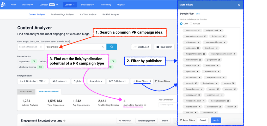 We then took those individual words and phrases, put them into BuzzSumo’s Content Analysis Report, and applied a “Domain” filter to limit our analysis to the top 100 most engaging publications.