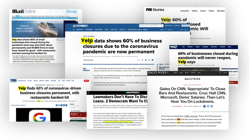 Plenty of these publishers created feature stories paraphrasing Yelp's original research, some just mentioned the research in passing, and others copied it verbatim.