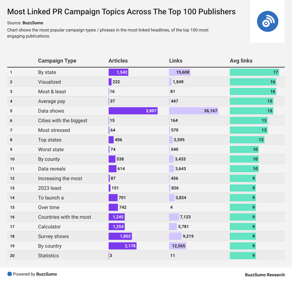 This gave us the ability to discover which campaign types and topics drive the most links, on average, in top-tier media.