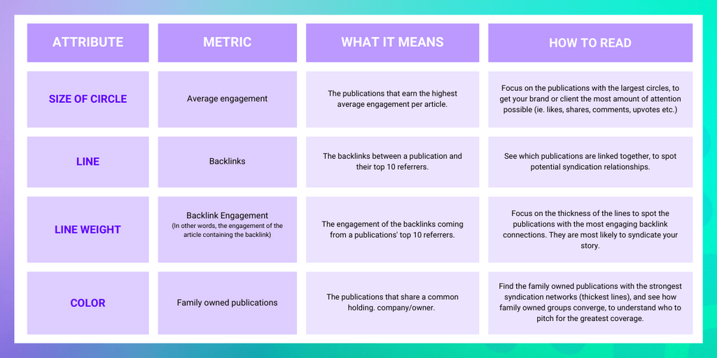 You want your coverage to be organically referenced by other publications, so that it naturally syndicates. Analyzing a publications' ability to pick up backlinks from other publications will help you do this. A backlink is a reference. Even if it's not verbatim content syndication (ie. where your story has been republished word for word), it infers syndication or a strong connection. Spotting the connections between publications can guide your pitching efforts, and help you focus on outreaching to media outlets the have the ability to spread your story further than their owned site. We focused our analysis on a closed group of the most engaging publications, as these are the ones that are most likely to drop high quality, relevant links. Another benefit of limiting the analysis to links shared between publishers is that they're also more likely to represent syndicated content. If we had opened up our analysis to any site (ie. ecommerce, B2C sites, etc.) the links analyzed would be less relevant, and therefore less likely to be syndicated.