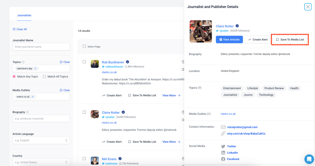 Then find the most relevant and engaging journalists, and add them to your media list.