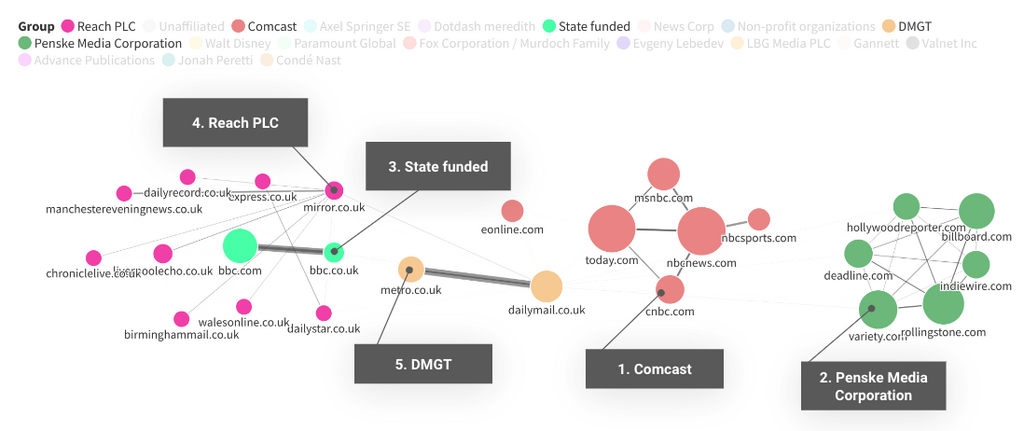 The top 10 were picked from within the same pool of publications (ie. the top 100), so that we focused on links (and inferred syndication) between the highest authority publications.