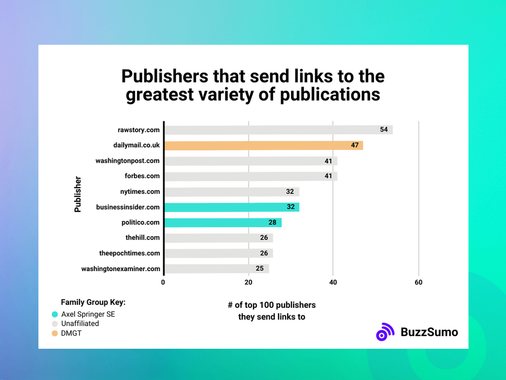 Raw Story passed links on to the greatest number of publishers via its content. Out of the 100 publications we analyzed, it sent links to 54 other publications.